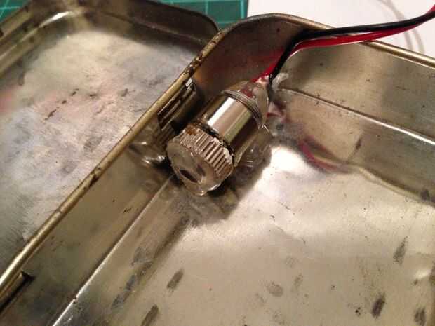 Ahora podemos pegar el láser en la lata para completar nuestro proyector. El enfoque me pareció mejor trabajado alimentar al módulo láser (no olvidar utilizar un tablero de conductor o resistencia!) mientras que la fijación en el lugar para permitir un ajuste fino de la posición. Si utiliza pegamento caliente para fijar en su lugar, tendrás unos segundos en la posición mirando la salida con el acetato de la imagen en su lugar mientras el pegamento se refresca. El módulo debe ser ya se puede ir y empujado contra el lado de la lata.