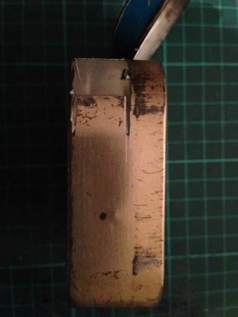 Antes de montar el láser en la lata, eran necesarias algunas modificaciones para fijar el acetato que proyectaría la sombra. Corté una tira de metal alrededor de 1cm de ancho desde una esquina de la lata, a partir de más allá donde la curva comienza en un borde y continúa donde termina la curva en el otro borde. La tira resultante fue enderezada con unas pinzas grandes y recortada para que solamente una pequeña longitud estaba todavía presente con una ranura en cada lado.