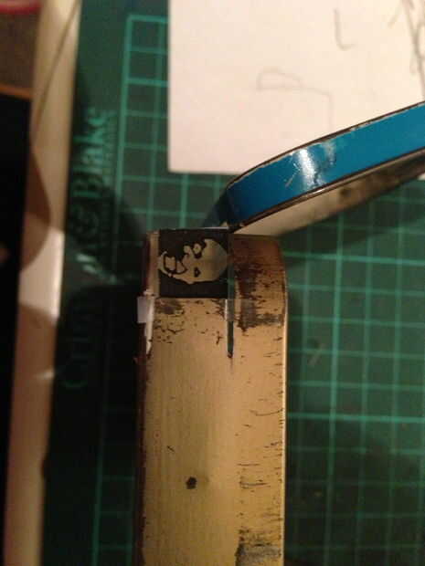Las imágenes fueron cortadas cerca alrededor tres de los lados, pero el tercer lado tenía una pieza extra de acetato izquierda en con una pequeña lengüeta en la parte superior e inferior (tipo de grasa ' t ' forma general). Las pestañas luego pueden ser encajadas en las ranuras que quedaron en la lata para mantener la imagen en lugar y permiten fácil ajuste o cambiar por una imagen diferente más adelante. Usted necesitará la imagen del acetato para permitir que las pestañas se deslice en las dos ranuras de la flexión. Al cerrar la tapa de la lata, si meter en la pestaña superior que va debajo de la tapa, esto ayudará a mantener la imagen en el lugar más seguro.