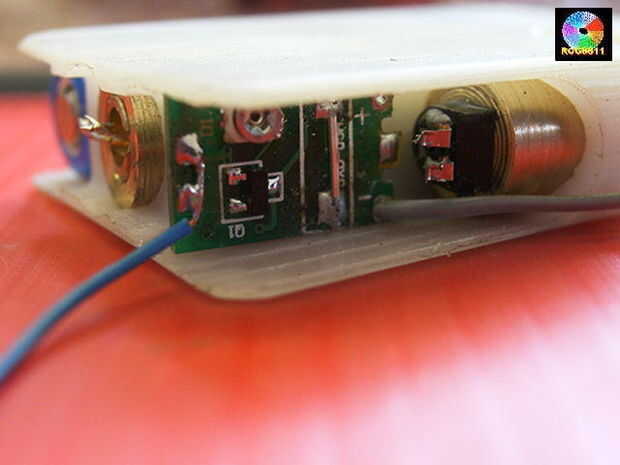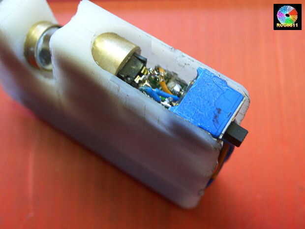 Fotos muestra el circuito del conductor en el lugar, seguido por el encendido apagado interruptor equipado. Un pequeño agujero se corta en el caso de zippo para acceder al conmutador.