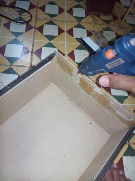 pegar las esquinas de la caja para evitar que se mueve. Estoy usando pegamento caliente porque me quedo sin pegamento PVA.