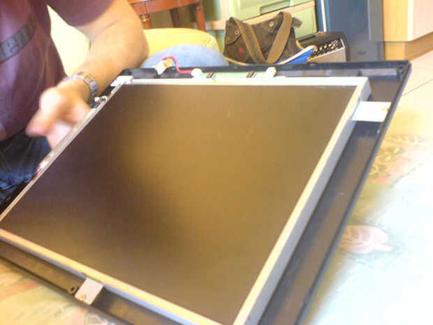En primer lugar, conseguir el cristal LCD de monitor cuidadosamente desenroscando, desmembramiento y curiosos. Tenga cuidado alrededor de los cables y usted debe ser fino. Una cosa útil es que en la mía, el cable desmontable de la placa base, por lo que hizo más fácil. Es útil tener un segundo par de manos para esto, en mi caso, he usado mi novia.