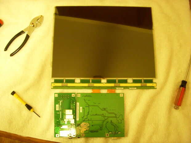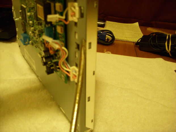 la luz de fondo se une por las abrazaderas alrededor de los bordes tan suavemente palanca/curva les apagado con una cabeza plana. suavemente Retire la pantalla lcd de la caja de luz de fondo. Tire a la luz de fondo. La retroiluminación de la LCD contiene Hg material peligroso como una luz fluorescente. Así disponerlo correctamente.