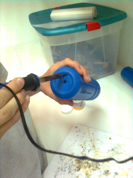 Se hace un agujero en el tubo pequeño y se pega la lupa en