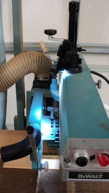 Aquí lo uso en mi Sierra de brazo radial, tirar hacia abajo entre el brazo y el motor para iluminar la línea de corte.