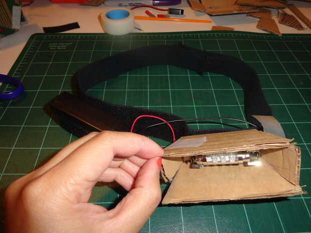 3. Coloque la primera pieza de Tape(sticky side) del Velcro en un extremo de su bucle de Velcro de 1 pulgada. Coloque la segunda pieza en el soporte de la batería. Poner la tercera pieza en la parte posterior de su caja de cartón.
