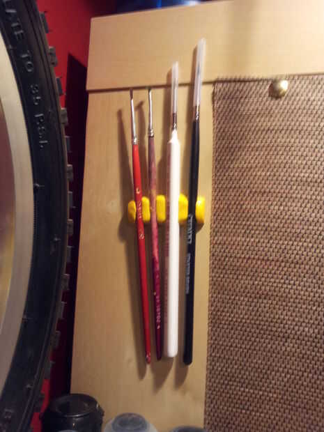 en mi anterior instructable construí un desplegable en el escritorio de proyecto. La mesa tiene un estante pequeño situado por encima de lo que proporciona espacio para almacenar herramientas y piezas de mi proyecto actual cuando el escritorio se dobla hacia abajo, pero no es lo suficientemente bueno guardar pinceles. Los cepillos del rodillo de o haz derribados, por lo que para combatir esto recurrí a cada sustancia favorita de los hackers SUGRU.