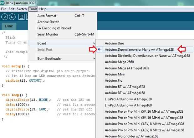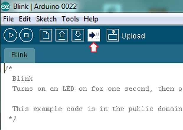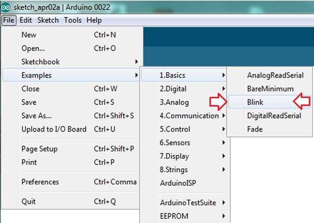 Paso 2 (Foto 1): Crack abre el software de Arduino y cargar un programa simple. Elegí abrir y cerrar, un pequeño programa que hará que un LED en el pin 13 a parpadear encendido y apagado.