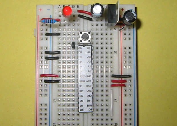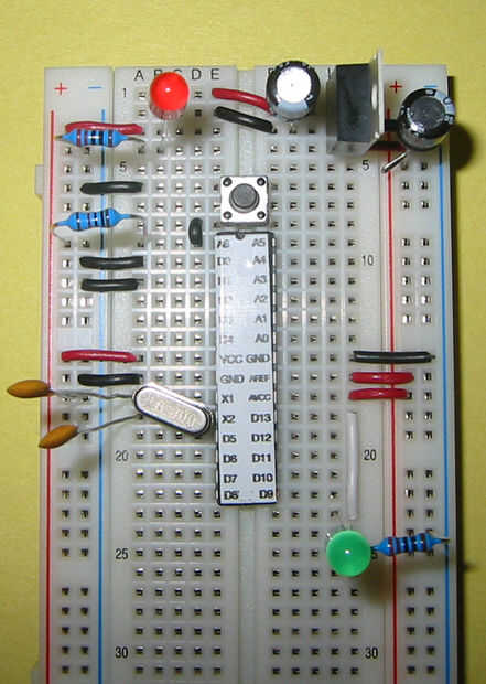 Paso/foto 2: Tiempo de hardware! Cosas a destacar: condensadores de disco de cerámica (como resistores) no tienen plomo positivo o negativo. En este instructable, cátodo (pata larga) el LED se va a poder y son seguidos por una resistencia a tierra.
