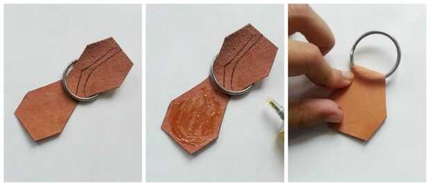 Tomar un llavero lo suficientemente grande como para colocar el llavero de cuero con él. Inserte la pieza de cuero de corte en el anillo con su revés hacia arriba y llevarlo al centro. Aplicar el pegamento en cualquier lado de revés uniformemente. Llevar al otro lado y unir con la parte encolada. Presione la parte doblada para asegurarse de que se pega muy bien.