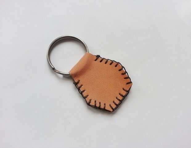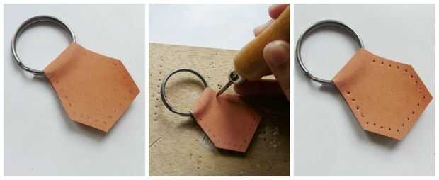 Cosemos alrededor de la frontera de la misma. Use un lápiz para marcar la línea de costura. Coloque el llavero en una tabla de madera. Use un punzón y un martillo para perforar los agujeros. Los agujeros de perforación hacen más fácil coser.