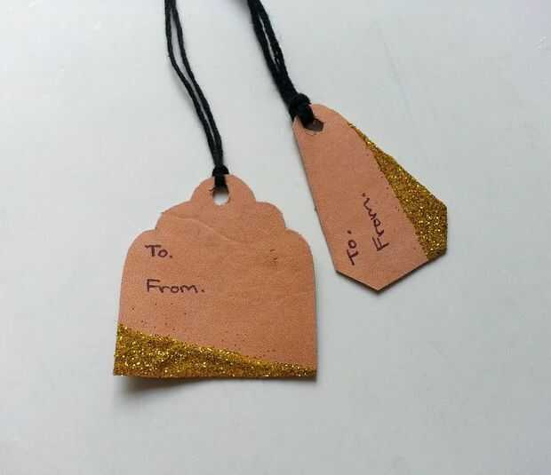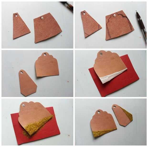 Ajustar y cortar el desecho de cuero en buen estado y hacer agujero en la parte superior de la etiqueta de regalo. Sorteo patrón de etiqueta en el corte de piezas de cuero. Corte con cuidado las etiquetas a lo largo del patrón. Aplique una capa delgada de pegamento en la parte inferior de la etiqueta. Espolvorear polvo de escarcha seca en el área de pegado. Deje que el pegamento se seque. Quitar brillo extra después de que el pegamento se seca.