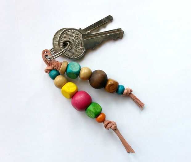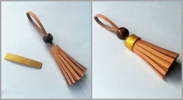 Tome un pedazo de cuero de 1 X 3.5 cm y color con pintura de oro. Pegamento en la parte superior de la borla de cuero como se muestra en la imagen. Deje que el pegamento se seque. Coloque la espiga con un llavero a través del lazo.