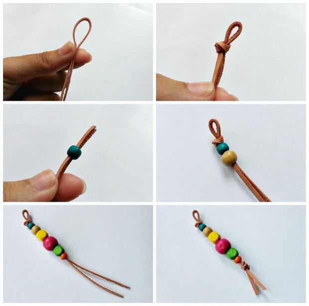 Doblar la tira de cuero en la mitad. Un pequeño nudo cerca del extremo cerrado, asegúrese de mantener un lazo. Inicio abalorios la tira por el extremo abierto. Grano a tanto como usted desea, pero recuerde que debe mantener suficiente tira para crear otro nudo en el extremo. Atar otro nudo al final después de que termines rebordear. El nudo debe ser adyacente a la última perla.