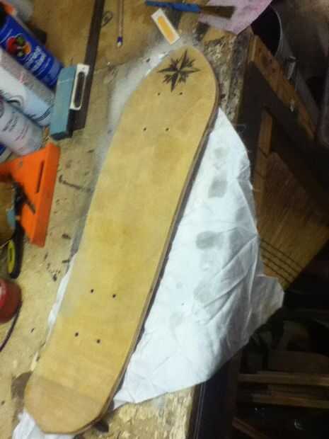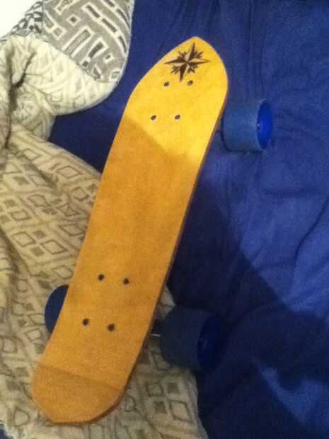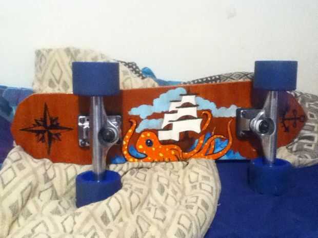 11. esta es mi creación favorita hasta ahora. las tres últimas fotos son de un patín que hizo y tenía la pintura de mi novia. tiene una cola de retroceso y una leve curva hacia arriba para compensar mi peso cuando estoy montando. en la parte superior tiene una estrella de dieciséis punto náutico que quemé en la nariz con mezcla de arena y poliuretano para agarre. en la parte inferior tiene artístico estilo de mi novia, que hizo un gran trabajo sobre la caoba, y tiene tres capas de poliuretano para acabado para arriba. tengo los camiones, ruedas, rodamientos y hardware fuera de Ebay.