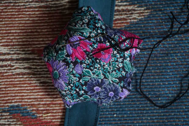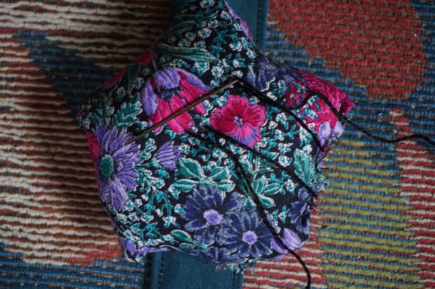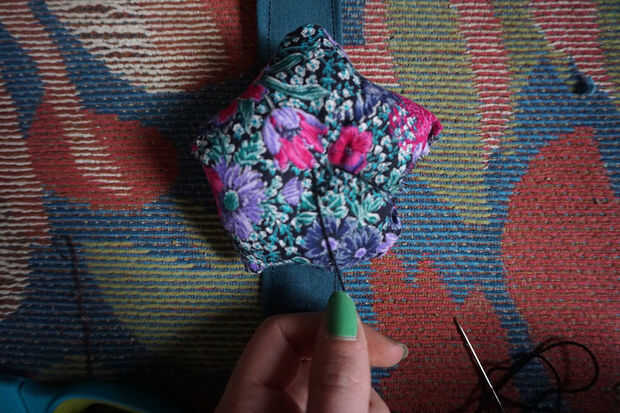 Ahora es el momento para unir estas dos piezas: Primero ponga su alfiletero relleno encima de la correa en el centro y levante la aguja a través de la parte inferior de la correa por el centro de tu alfiletero. A continuación enrolle el hilo alrededor del centro de uno de los lados y hacia atrás a través de la parte inferior de la distorsión en corsé y repita este paso para los otros cuatro lados. Una vez que hayas hecho esto, acaba de poner en unos puntos más desde el centro de tu alfiletero a través de la correa de reforzarlo.
