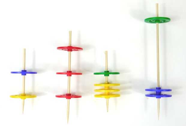 Tapas pueden hacerse insertando una pieza de un pincho de bambú a través del centro de una rueda de plástico. Pero no tiene que parar allí. ¿Y si el pincho es más largo o más corto? ¿Y si añades más ruedas? ¿Cómo tener la más arriba de las ruedas sobre la brocheta vs baja afecta el rendimiento? ¿Es posible añadir a la parte superior sin alterar su equilibrio? Hay una sorprendente cantidad de espacio para la experimentación.