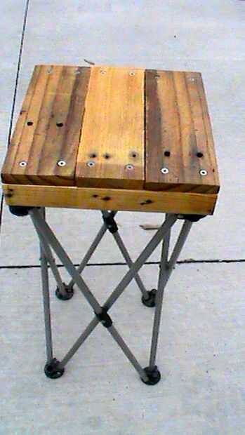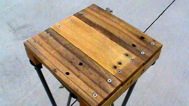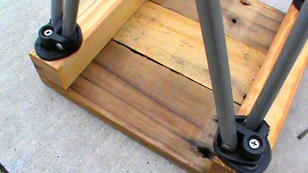 Arrancaron un 10" 2 x 4 por la mitad, dándome dos piezas que atornillado en desde la parte inferior (Figura 4). Dos de los agujeros en el marco de la silla ya eran del tamaño perfecto, (cuadro 5) pero los otros dos eran de grandes, así que utilicé las arandelas (cuadro 6). A continuación corté tres tablas de 10" de la parte superior. Tuve que rasgar ligeramente una de las juntas para conseguir que se ajuste.