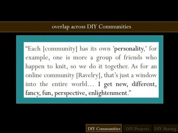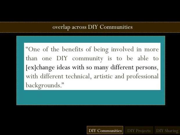 A pesar de la piscina de gran respuesta, menos de 20 participantes pertenecen exclusivamente a uno de Instructables, Adafruit, Dorkbot o Etsy. Los participantes de las seis de las comunidades estudiadas indican participación en otros grupos DIY, incluyendo Flickr, LiveJournal, Yahoo grupos, ThreadBanger, hacer revista de Knitter revisión, deviantART, Cut Out + Keep y Crochetville.