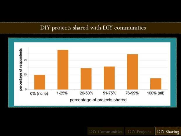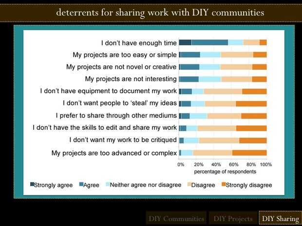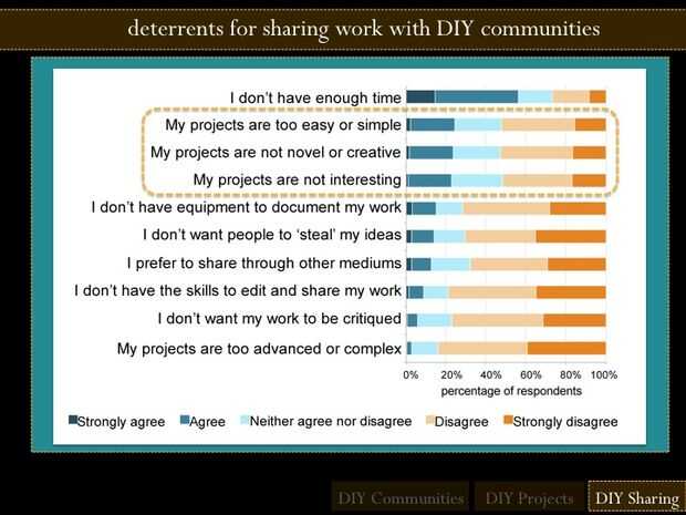 Falta de tiempo es la principal razón para no compartir proyectos con comunidades bricolaje, como se indica en más de la mitad de nuestros encuestados. Otras medidas preventivas comunes son evaluaciones negativas de los encuestados de sus proyectos (falta de creatividad, novedad o complejidad).