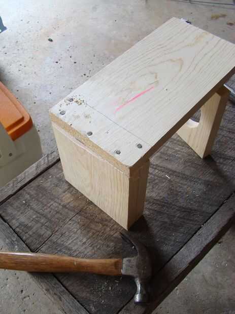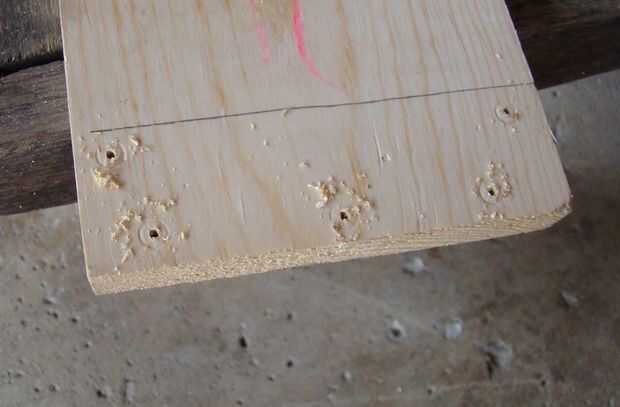 Pretaladrados cinco agujeros del clavo en la pieza de 11 pulgadas que se utiliza para la parte de atrás. Los clavos de la parte inferior tres entrará en la pieza. Las mejores dos uñas entrarán en la pieza con el orificio grande y como tal fueron colocadas cerca del borde.