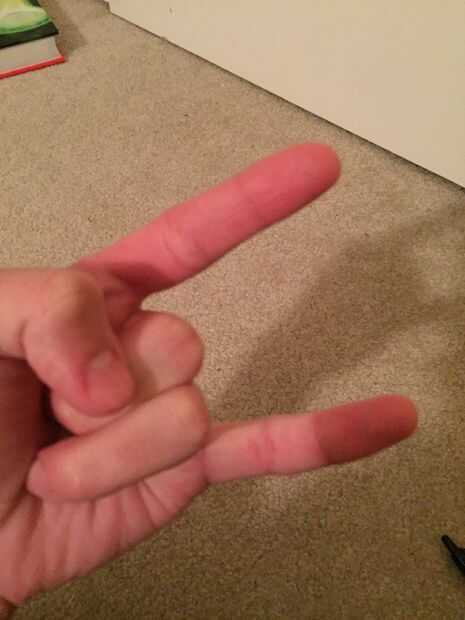 Extienden los dedos índice y meñique hacia fuera como se muestra arriba. Sujetar los brotes entre el pulgar y el dedo índice de su mano no dominante. El extremo de los audífonos (el extremo con el tapón) debe caer detrás del meñique.