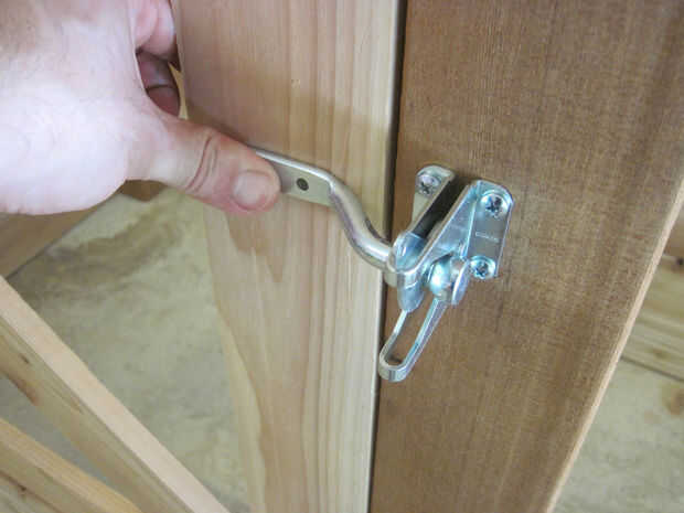 Tornillo del pestillo de la puerta en su lugar en el poste central 4 x 4. Siga las instrucciones en el paquete para asegurarse de que obtener las dos piezas alineadas correctamente.