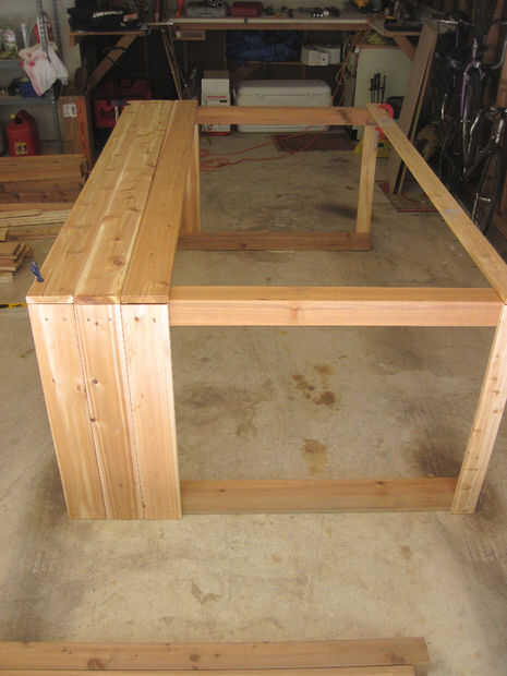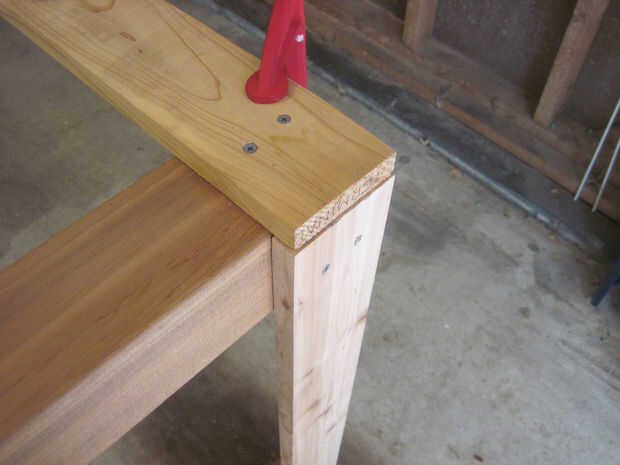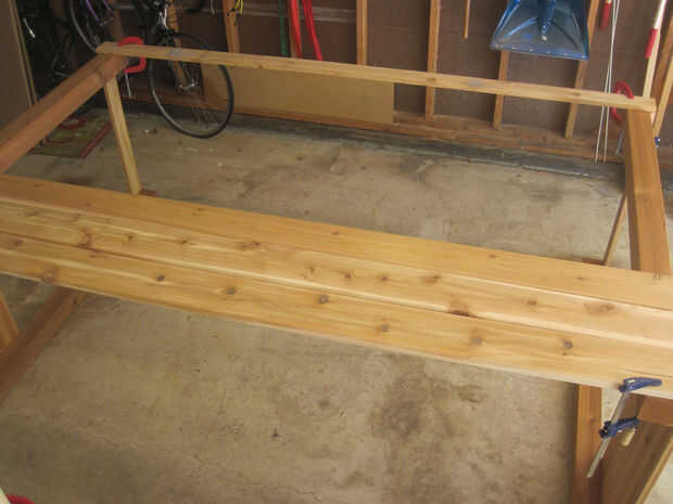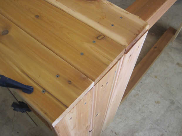 • Tres ponen 8 pedazos de terrazas en la parte inferior y un 8' 1 x 4 en la parte superior de 5/4". Esto es donde las abrazaderas o un amigo para ayudarle a sujetar cosas constante comenzará a venir práctico. Asegúrese de que todo es cuadrados, a continuación, taladre los agujeros y conecte otra vez, cada pedazo de madera para el 4 x 4 con dos tornillos.