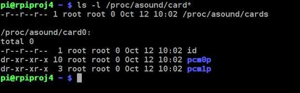 Sólo debe haber un principio de carpeta con la tarjeta de la palabra (card0) en mi caso ya que hay sólo tarjeta de sonido instalada. La carpeta card0 tiene 2 carpetas que comienzan con las palabras "pcm". Una carpeta de pcm representan un dispositivo de reproducción. Por lo tanto la tarjeta ALSA de broadcom tiene 2 dispositivos ALSA.