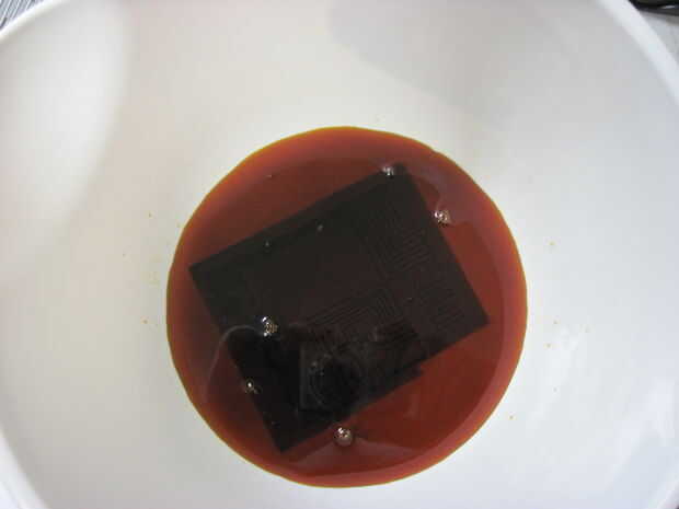 utilizando un vaso o recipiente de plástico colocar la placa en la parte inferior. Llene el recipiente hasta la cubierta del tablero de un 1/2" a 1 1/2" de la solución de la aguafuerte. Agitar suavemente el recipiente de lado a lado. Tardará aproximadamente una hora y media a temperatura ambiente.  Con el líquido a temperaturas más altas tendrá menos tiempo para desarrollar las tablas.
