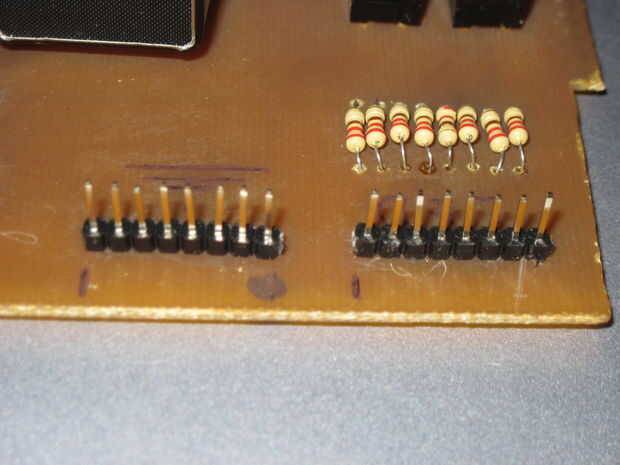 Finalmente agregar todos los componentes como se había establecido que en el reverso de la Junta. Interruptores, interruptor dip pack, hombres encabezados, resistencias y contactos de la batería.