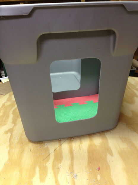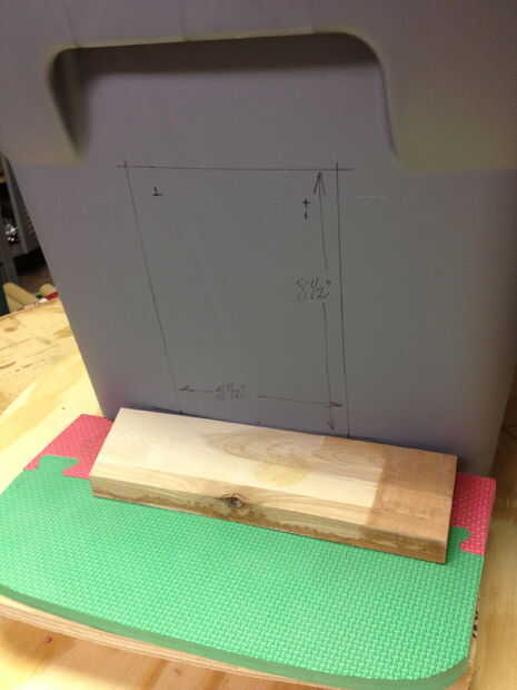 Porque nuestro gato es un macho grande, hice las puertas de algo grande saber que nuestros perros no sería capaces de entrar. Las puertas son 5 1/2" de ancho y 8 1/2" alto. Alternativamente, podría cortar un círculo si tienes un perro más pequeño que le gusta a la sartén. Usando el piso falso y mat como una guía, usa una tabla de desecho de 3/4" para marcar la parte inferior de ambas puertas. Esto asegura que el suelo está por debajo de la parte inferior de la puerta y permite la adición de un pedazo de alfombra en el futuro. Alfombra haría un mejor trabajo de la eliminación de gatos como tu gato sale de la olla. El borde de la puerta también permite una olla profunda interior de 4" para sujetar la camada.