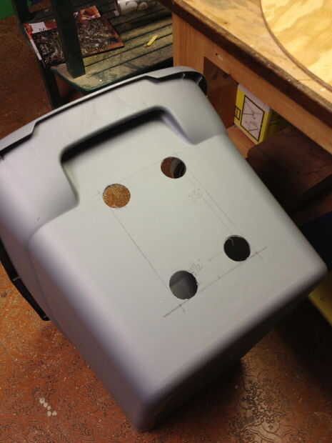 Una vez que las dimensiones de la puerta fueron marcadas, también marcó puntos 3/4" de cada esquina para la perforación de los agujeros de 1 1/2". Esto es principalmente para el aspecto y usted podría simplemente a mano alzada también apertura de la puerta. Foto 2 muestra los 4 agujeros y utilicé mi rompecabezas para cortar entre los agujeros y completar las aberturas de la puerta. El corte superior es mucho más fácil hacer desde dentro de la caja. Un archivo se utiliza para suavizar los recortes y elimine las rebabas. Foto 3 muestra la completa apertura y Hall de entrada.