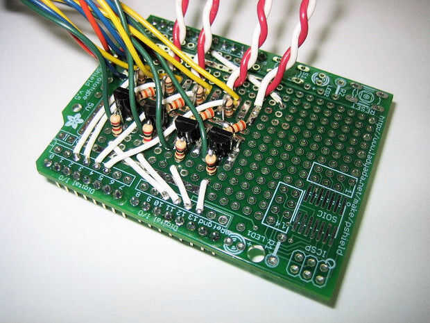 Entrada de conexión al microcontrolador y pines de salida son manejadas por las tomas de puente negro ubicadas a lo largo de los bordes de la placa Arduino. Conecte los conductores de estos encabezados femeninos o crear una placa de circuito con hombres encabezados que aparean para arriba con los encabezados de la mujer en la placa Arduino. La electrónica que desea controlar con el Arduino se puede construir en este circuito de acoplamiento. Esto crea lo que se conoce en el mundo de Arduino como un "escudo".