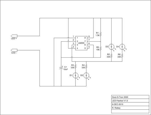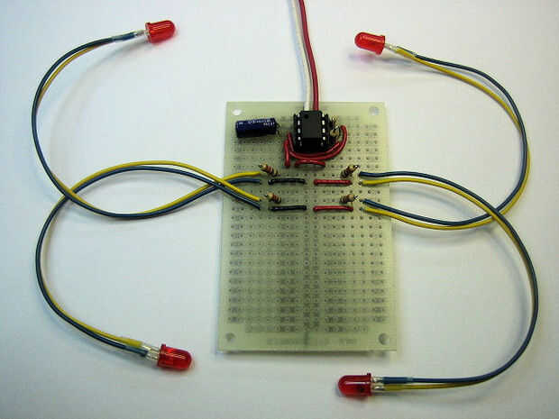 La primera foto muestra un circuito que parpadeará 2 pares de LEDs en un patrón de alternancia rápido. Esto se hace usando uno de los verdaderos "caballos de batalla" del mundo de la electrónica – circuito integrado 555 temporizador. Aplicando 9 voltios a este circuito consigues algunos destellos ligeramente satisfactorias. He montado el circuito en el cuadro de botón grande y taladrar 4 orificios para montar los LEDs alrededor del botón grande.