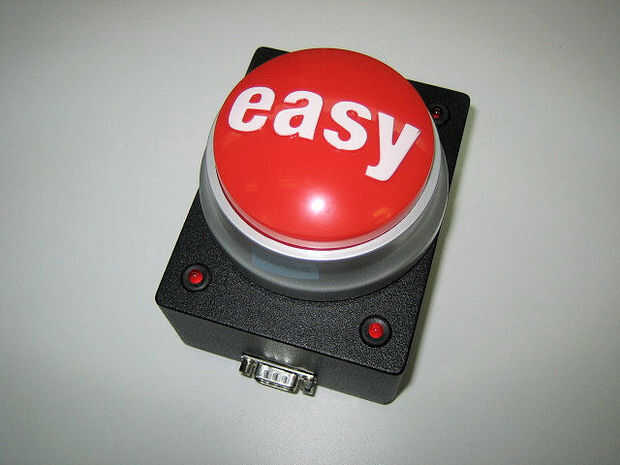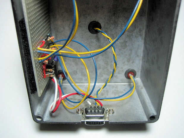 La cuarto foto muestra el interior de la caja del botón grande. Utilicé una herramienta giratoria Dremel con un disco de corte de muesca hacia fuera del orificio de montaje del conector DB-9 en el lado de la caja. Esto permite que un cable para conectar la caja del botón en la consola de control principal de Test-O-Tron 3000. El conector contiene los 2 cables desde el interruptor de botón fácil y otra 2 cables para llevar corriente al tablero LED intermitente para activar las luces. Cada caja de botón grande tiene estos mismos 4 cables que están conectados a los cerebros de consola de control maestro de prueba-O-Tron 3000 (el escudo de Arduino). El botón fácil fue asegurado a la parte superior de la caja con fuerza industrial Velcro como era el circuito interno. Como paso final para el botón he añadido cuatro patas de goma a la parte inferior de la caja.
