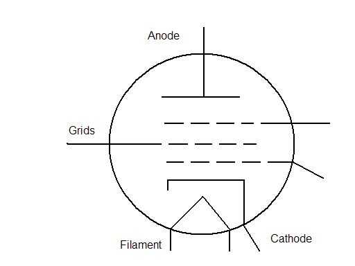 Abajo está el diagrama eléctrico para un tubo típico. El filamento se calienta cuando la corriente pasa a través de él. Cuando está calentado por el filamento, el cátodo emite electrones que son atraídos por la carga al ánodo. Varias rejillas introducir cargas de señal, a menudo fluctuante, para restringir o para acelerar el flujo de electrones hacia el ánodo.