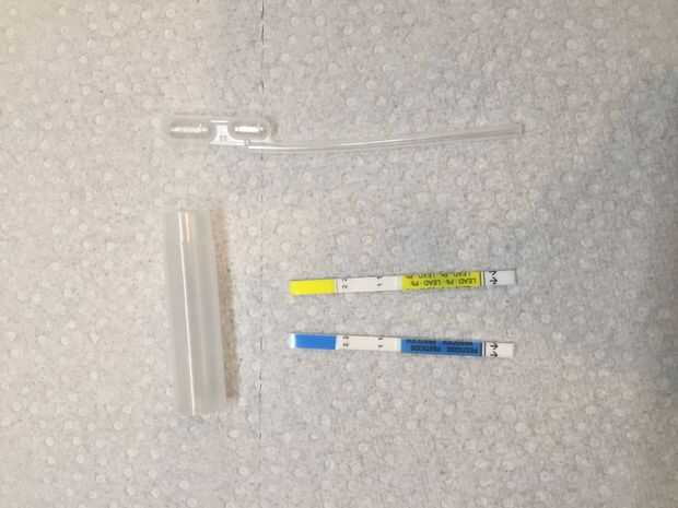 Abra el paquete de Led, pesticida y saque todo el contenido. El paquete contiene un frasco de prueba, una pipeta cuentagotas, dos tiras de prueba y un desecante (para descartar).