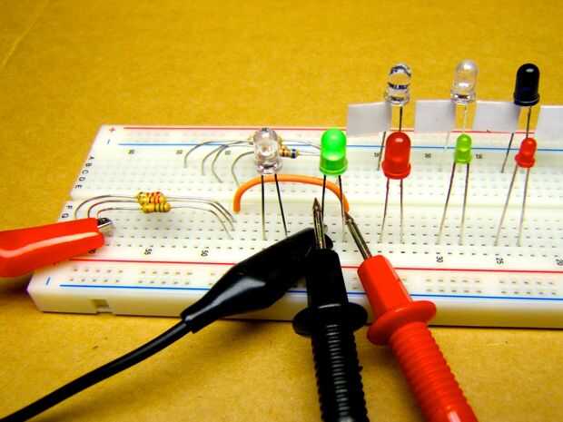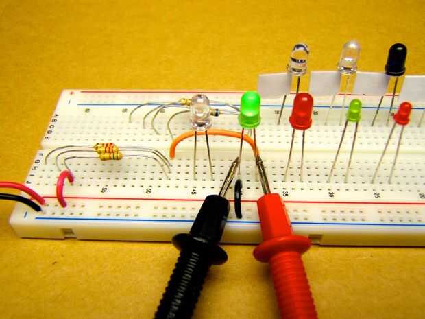 Mi primer paso fue medir la caída de tensión en diferentes colores de LEDs, con una variedad de resistencias serie para limitar la corriente.
