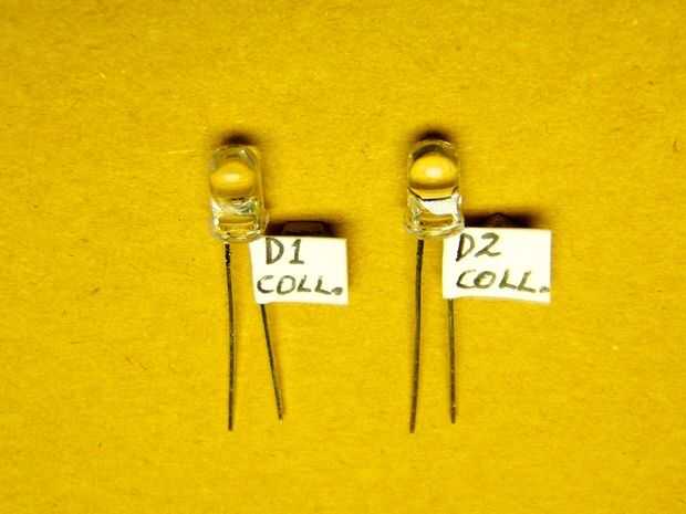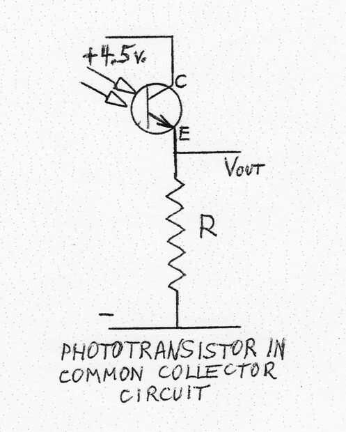 He utilizado la configuración de colector común para obtener tensiones que aumentan cuando se detecta la luz. El embalaje del detector declaró que el colector es el plazo de ejecución corto y tiene una parte plana pequeña en el borde de su envase en forma de sombrero. Va al borne positivo de la batería. El emisor es el largo. Va a la resistencia, que va a la terminal negativa. (En Internet hay algunos sitios web que muestran lo contrario de los conductores de cortos y largos de un fototransistor).