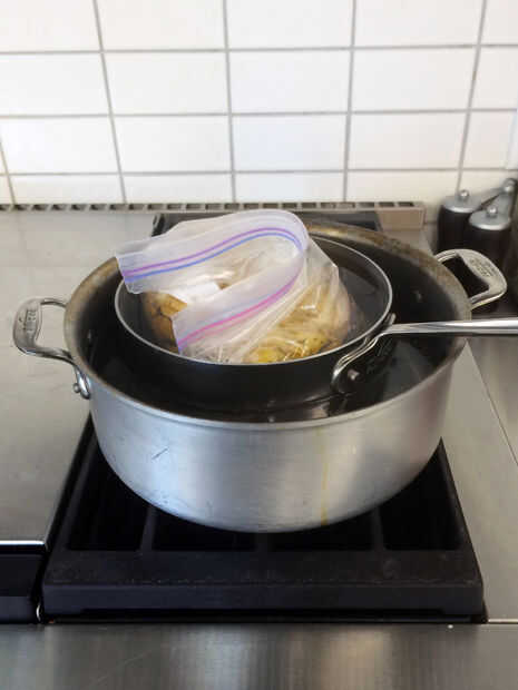 Con dos macetas, vas creando una caldera doble; en la olla exterior, llenar con 3-4 pulgadas de agua con la olla interior ya situada dentro y en el recipiente interior, suficiente agua para cubrir la mayor parte de la bolsa de fruta. Cuando el agua en la olla exterior llegue a hervir, reduzca el calor al medio y colocar la bolsa o ' fruta en el recipiente interior y déjelo reposar 15 minutos. La bolsa no debe derretirse, pero usted puede doble bolsa sólo para estar seguro (a diferencia de algunos otros casos donde doble embolsado es no sólo aconsejable, sino francamente peligroso).