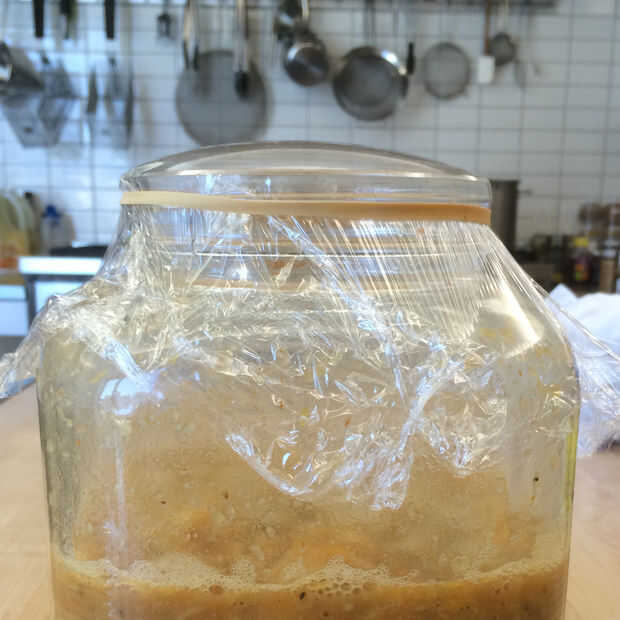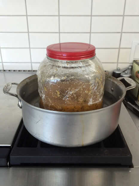 Ahora sería un buen momento para revolver el contenido de la jarra. Cambiar la envoltura plástica.