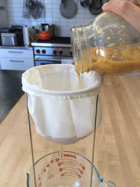 Metal será suficiente pero tela funciona mejor (y se mantiene fiel al método tradicional de elaboración de pruno, puesto que los internos tienen que ver con camisas, sábanas, etc.) ya que menos de la pulpa lo hace a través al producto final. Utilicé un filtro de gelatina.