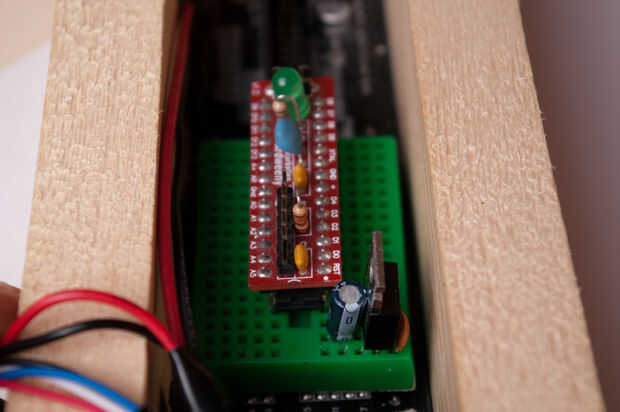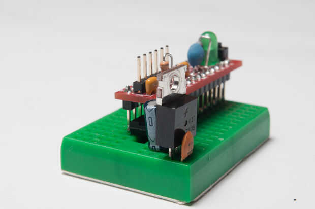 Compruebe la ficha técnica para su regulador de voltaje determinar que el pin es de entrada, que es tierra y cual es la salida (por lo general la secuencia es IN-GND-OUT, va de izquierda a derecha mirando el frente del regulador, pero asegúrese de su hoja de datos). Desde bus de tierra del regulador está recibiendo probablemente un poco completo por ahora, utilice un puente pequeño protoboard para conectar a un bus no utilizado en el otro lado de la protoboard. Enchufe el cable de corriente del campo común del conmutador en bus de entrada del regulador y el cable de tierra desde el DC jack en el nuevo bus de tierra. Usando dos puentes más (rojos y negros) conectan salida de regulador de voltaje y el negativo común a los buses de conexión a la Ardweeny V + y GND pernos.