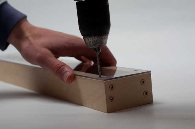 Cortar el forro con una sierra de mano, Sierra de mesa o el implemento de corte de su elección. Alinee la pieza cortada en la parte posterior del marco y perfore orificios piloto seis a través del material de apoyo y en la parte posterior de la estructura sí mismo. Ahora está listo para cerrarse encima de una vez toda la electrónica en su lugar y funcionando.