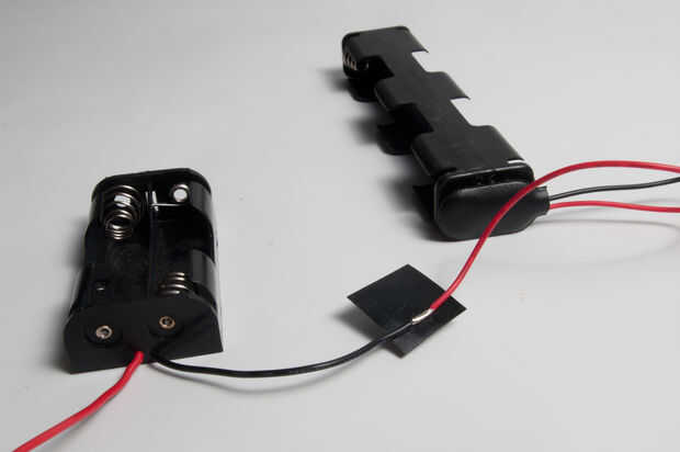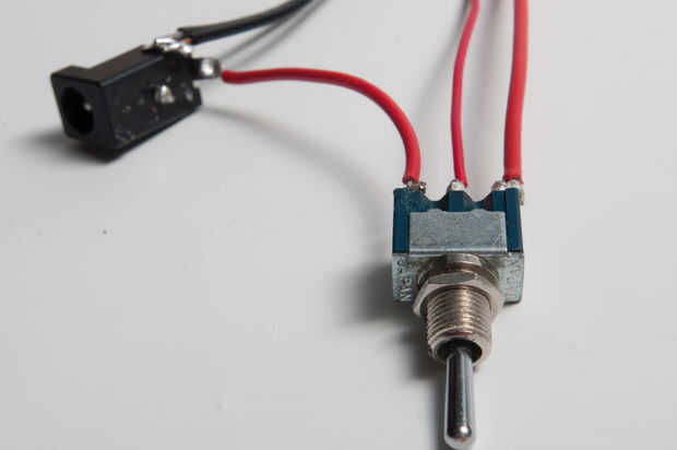 Corte el extremo de uno de sus puentes de tablero negro y tira el cable de la lata. Hacer lo mismo con un Jersey rojo. Soldar el extremo sin el puente terminó en una protoboard negro y el cable negro de los paquetes de baterías en el terminal negativo de su toma de poder de DC. Soldar un trozo corto de hilo rojo entre el terminal positivo en la toma de CC y uno de los contactos fuera del interruptor. Conecte el jumper rojo terminó en un protoboard el interruptor común, y la batería positiva al terminal de interruptor de tercera. Si todo ha ido bien, debe tener un poder de posición con la palanca del interruptor en el centro, una posición de poder de batería a un lado y el adaptador de alimentación en el otro.