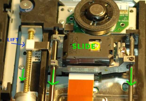 Así que, como se indica en la imagen, cuidadosamente levante el rectángulo blanco de la rosca y deslice el ensamblaje del láser por los rieles hacia la parte posterior del sistema. Puede resistir al principio, pero debe moverse sin mucha fuerza.