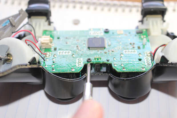 El PCB está conectado a la carcasa de plástico blanco a través de los motores de vibración. No hay que desoldarlos y separar la unidad en dos piezas. Te recomiendo levantar el plástico blanco y manteniendo la cara todo abajo (palos apuntando hacia abajo). Usted debe ser capaz de sacar la cosa entera y en los botones y debajo de la cáscara.