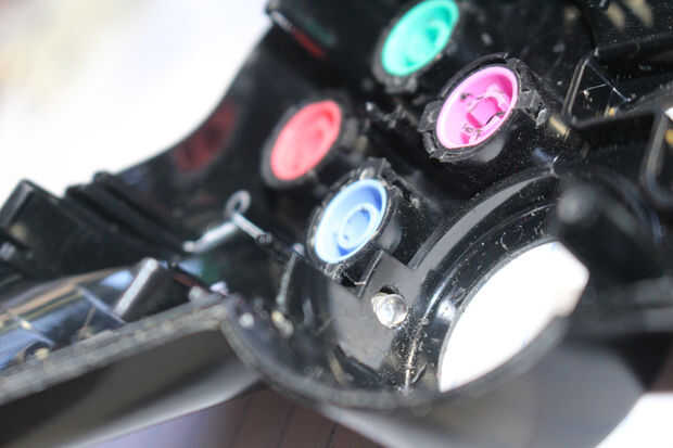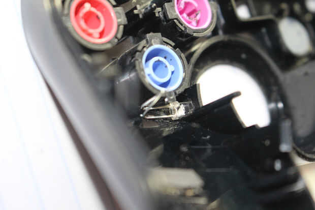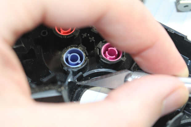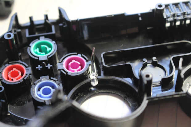 He encontrado que dos LEDs trabajo mejor a la luz cada palillo - una posición horizontal y uno vertical en el borde exterior de cada caja de palo. Porque no tengo un taladro o dremel, tuve que taladrar los agujeros para cada LED a mano. Puse el punto de una cuchilla exacto contra el plástico y trenzado hasta poco, luego siguió girando la hoja y poco a poco agrandando el agujero. Realmente prefiero este método como puedo controlar exactamente cuánto del plástico consigue comido lejos y puedo hacer los LEDs caben muy bien en los agujeros. Esto es útil, ya que en este mod perforó los agujeros tan bien que sentí que los LEDs no necesitan caliente pegamento para quedarse. Dicho esto, un taladro o dremel sería mucho más eficiente.