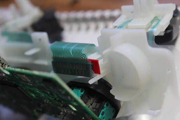 Esta película entra en contacto con la placa de circuito en los pernos detrás de la almohadilla negro pequeño (ver imágenes). Como edad de controladores, este pierde su elasticidad y no empuje los pasadores como contra el PCB ya que necesita. Para darle un pequeño impulso, tome un pedazo de cinta (yo usé cinta aislante roja), doblar por la mitad y colóquela detrás de la almohadilla. Esto empujará las clavijas un poco más segura contra el tablero. Esta solución poco puede dar fácilmente unos años extras a un controlador que parece que está en su camino.
